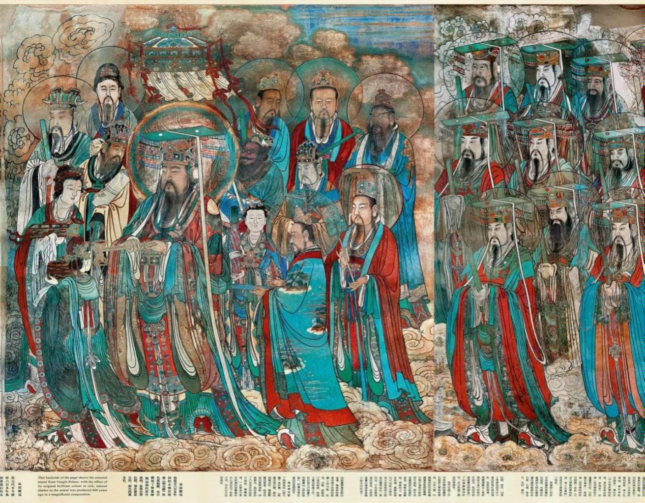 永樂宮是位于山西運(yùn)城芮城縣的元代建筑群,自1247年始建,歷時(shí)111年方才竣工。作為國(guó)家首批重點(diǎn)文物保護(hù)單位,宮內(nèi)現(xiàn)存元代壁畫達(dá)1005.68平方米,壁畫因極高的藝術(shù)水準(zhǔn),被譽(yù)為“東方藝術(shù)畫廊”。其中,藝術(shù)成就最高的當(dāng)屬三清殿內(nèi)的《朝元圖》。這幅長(zhǎng)97米、高4.4米的巔峰之作,描繪了道家諸神朝拜元始天尊的盛大場(chǎng)景。畫中290位神祇分列東西,以八位主神為中心,構(gòu)圖嚴(yán)謹(jǐn)平衡,衣冠服飾、面容神態(tài)無(wú)一雷同,堪稱中國(guó)古代人物畫的巔峰。