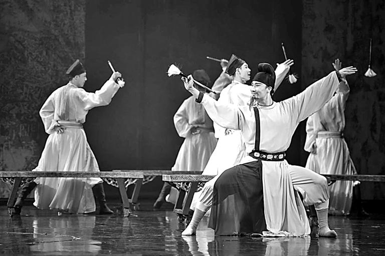 當(dāng)代舞劇跨媒介創(chuàng)作還通過對(duì)視覺圖像符號(hào)的動(dòng)態(tài)轉(zhuǎn)化、意象構(gòu)建與詩化敘事,實(shí)現(xiàn)文學(xué)藝術(shù)作品的“IP再生”。如舞蹈詩劇《只此青綠——舞繪〈千里江山圖〉》(簡(jiǎn)稱《只此青綠》)。這部對(duì)宋代傳世畫作跨藝術(shù)門類創(chuàng)作的舞蹈詩劇,以極致的視覺化“修飾”戲劇性,使靜態(tài)山水畫面呈現(xiàn)出動(dòng)態(tài)的交響節(jié)奏,充分發(fā)揮舞蹈作為動(dòng)態(tài)造型藝術(shù)的媒介特質(zhì)與視覺效應(yīng)?!吨淮饲嗑G》以“詩劇”為體裁,以“展卷、問篆、唱絲、尋石、習(xí)筆、淬墨、入畫”等篇章為綱目,體現(xiàn)出詩歌體戲劇敘事的特點(diǎn),既帶有濃烈的詩情、詩意,也有著戲劇的情節(jié)、場(chǎng)面。浪漫的詩性和抒情性,給予觀眾廣闊、豐富的視覺意象與想象空間,凸顯“舞繪”之本義、彰顯舞蹈之魅力。又如分別以“天下第一行書”《蘭亭集序》、“天下第二行書”《祭侄文稿》為題材創(chuàng)作的舞劇《永和九年——蘭亭集序舞傳》和《顏真卿》,用舞蹈的身體之動(dòng)呈現(xiàn)書法的筋骨之美,讓觀眾看見文字背后的情感、哲思與文化氣度,是當(dāng)下創(chuàng)作者有意識(shí)挖掘傳統(tǒng)文化中的典型人物的體現(xiàn)。