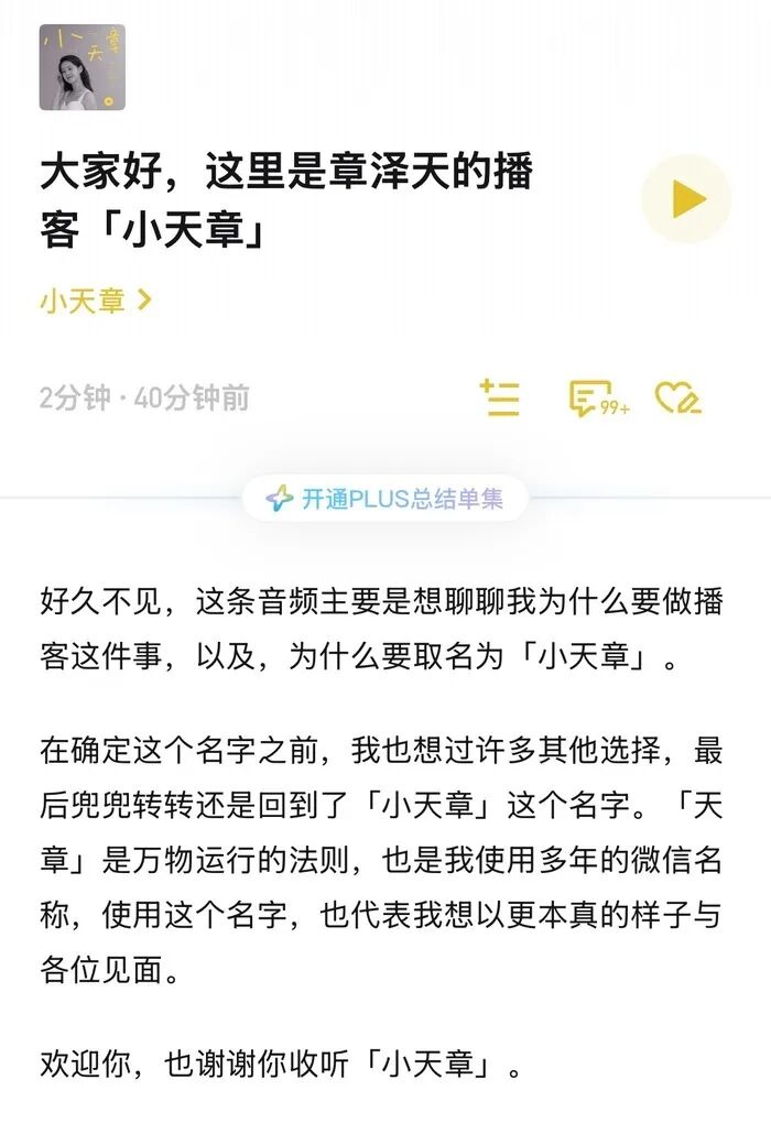 1月12日,章澤天個(gè)人播客開(kāi)通,取名為“小天章”,首條播客shownotes中,章澤天談到“天章”是萬(wàn)物運(yùn)行的法則,也是其使用多年的微信名稱,使用這個(gè)名字,也代表其想以更本真的樣子與各位見(jiàn)面。