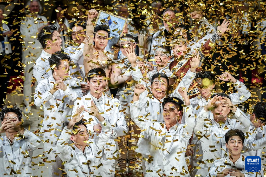 ??1月12日,在匈牙利首都布達(dá)佩斯,中國(guó)雜技團(tuán)演員在頒獎(jiǎng)儀式上慶祝。
