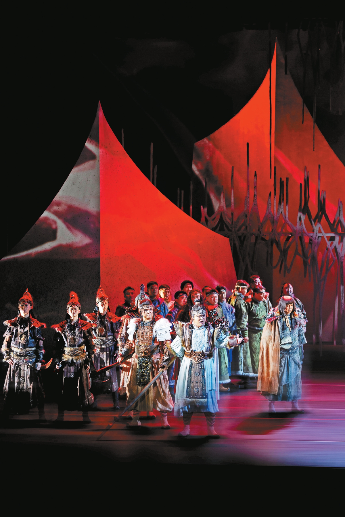 歌劇達(dá)到的高度往往和整個(gè)歌劇制作流程的規(guī)范是分不開的。一部歌劇要想把作曲家的樂譜轉(zhuǎn)化成完整的演出呈現(xiàn)在舞臺(tái)上,需要經(jīng)歷做音樂作業(yè)、坐排、合成等數(shù)個(gè)環(huán)節(jié)。作為舞臺(tái)領(lǐng)域的專家,陳蔚與地方合作的時(shí)候,都不遺余力地推廣科學(xué)的演出制作流程。在排演內(nèi)蒙古藝術(shù)劇院的首部歌劇《江格爾》時(shí),陳蔚從給演員上戲劇表演、形體集訓(xùn)課開始,一點(diǎn)點(diǎn)地將科學(xué)的流程蘊(yùn)含在日常的工作中,對當(dāng)?shù)氐谋硌蓐?duì)伍和幕后團(tuán)隊(duì)進(jìn)行了系統(tǒng)培養(yǎng)?!耙钊胪诰蛎總€(gè)演出團(tuán)體的藝術(shù)特長,真正站在地方院團(tuán)的角度打造劇目,發(fā)揮其特長,彌補(bǔ)其不足?!标愇当硎?,唯有充分調(diào)動(dòng)各方力量,減輕地方負(fù)擔(dān),讓作品越演越有價(jià)值,才能真正留下精品。